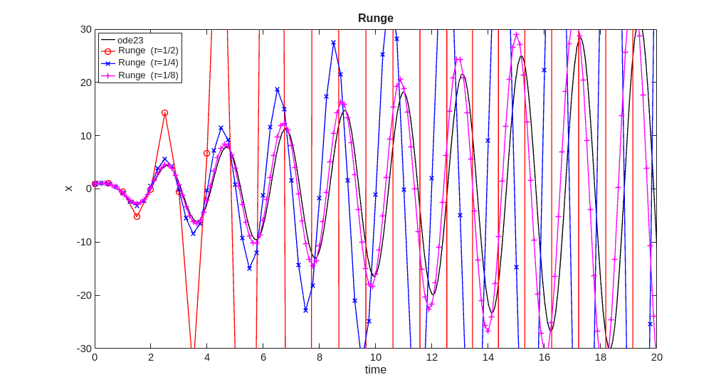 omega = 2.9; oscillator = @(t,x)[0 1; -b -a]*x + [0; c*cos(omega*t)]; [t1,x1]=ode23(oscillator, [t0, T], x0); figure; plot(t1,x1(:,1),'-k','DisplayName','ode23'); hold on; title("Euler"); xlabel('time'); ylabel('x'); [t,x]=eul(oscillator, t0, T, x0, 1/2); plot(t,x(:,1),'-ro','DisplayName','Euler (\tau=1/2)'); [t,x]=eul(oscillator, t0, T, x0, 1/4); plot(t,x(:,1),'-bx','DisplayName','Euler (\tau=1/4)'); [t,x]=eul(oscillator, t0, T, x0, 1/8); plot(t,x(:,1),'-m+','DisplayName','Euler (\tau=1/8)'); legend('Location','NorthWest'); ylim([-30, 30]); % Following increase plot width pos = get(gcf,'position'); pos(3) = pos(3)*1.5; set(gcf,'position', pos); figure; plot(t1,x1(:,1),'-k','DisplayName','ode23'); hold on; title("Runge"); xlabel('time'); ylabel('x'); [t,x]=runge(oscillator, t0, T, x0, 1/2); plot(t,x(:,1),'-ro','DisplayName','Runge (\tau=1/2)'); [t,x]=runge(oscillator, t0, T, x0, 1/4); plot(t,x(:,1),'-bx','DisplayName','Runge (\tau=1/4)'); [t,x]=runge(oscillator, t0, T, x0, 1/8); plot(t,x(:,1),'-m+','DisplayName','Runge (\tau=1/8)'); legend('Location','NorthWest'); ylim([-30, 30]); % Following increase plot width pos = get(gcf,'position'); pos(3) = pos(3)*1.5; set(gcf,'position', pos); figure; plot(t1,x1(:,1),'-k','DisplayName','ode23'); hold on; title("Runge-Kutta"); xlabel('time'); ylabel('x'); [t,x]=rk_classical(oscillator, t0, T, x0, 1/2); plot(t,x(:,1),'-ro','DisplayName','Runge-Kutta (\tau=1/2)'); [t,x]=rk_classical(oscillator, t0, T, x0, 1/4); plot(t,x(:,1),'-bx','DisplayName','Runge-Kutta (\tau=1/4)'); [t,x]=rk_classical(oscillator, t0, T, x0, 1/8); plot(t,x(:,1),'-m+','DisplayName','Runge-Kutta (\tau=1/8)'); legend('Location','NorthWest'); ylim([-30, 30]); % Following increase plot width pos = get(gcf,'position'); pos(3) = pos(3)*1.5; set(gcf,'position', pos);