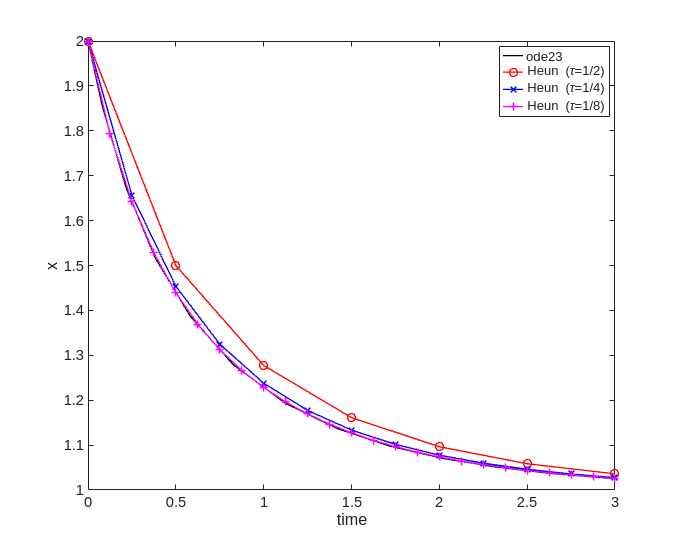 [t,x]=heun(logistic, t0, T, x0, 1/8); plot(t,x,'-m+','DisplayName','Heun (\tau=1/8)');