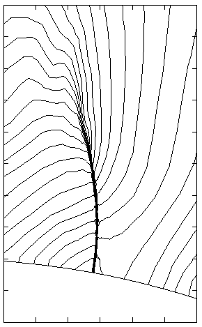Distribution of the Mach number along walls. Detail of the mesh near the shock wave Detail of the isolines of Mach number near the shock wave