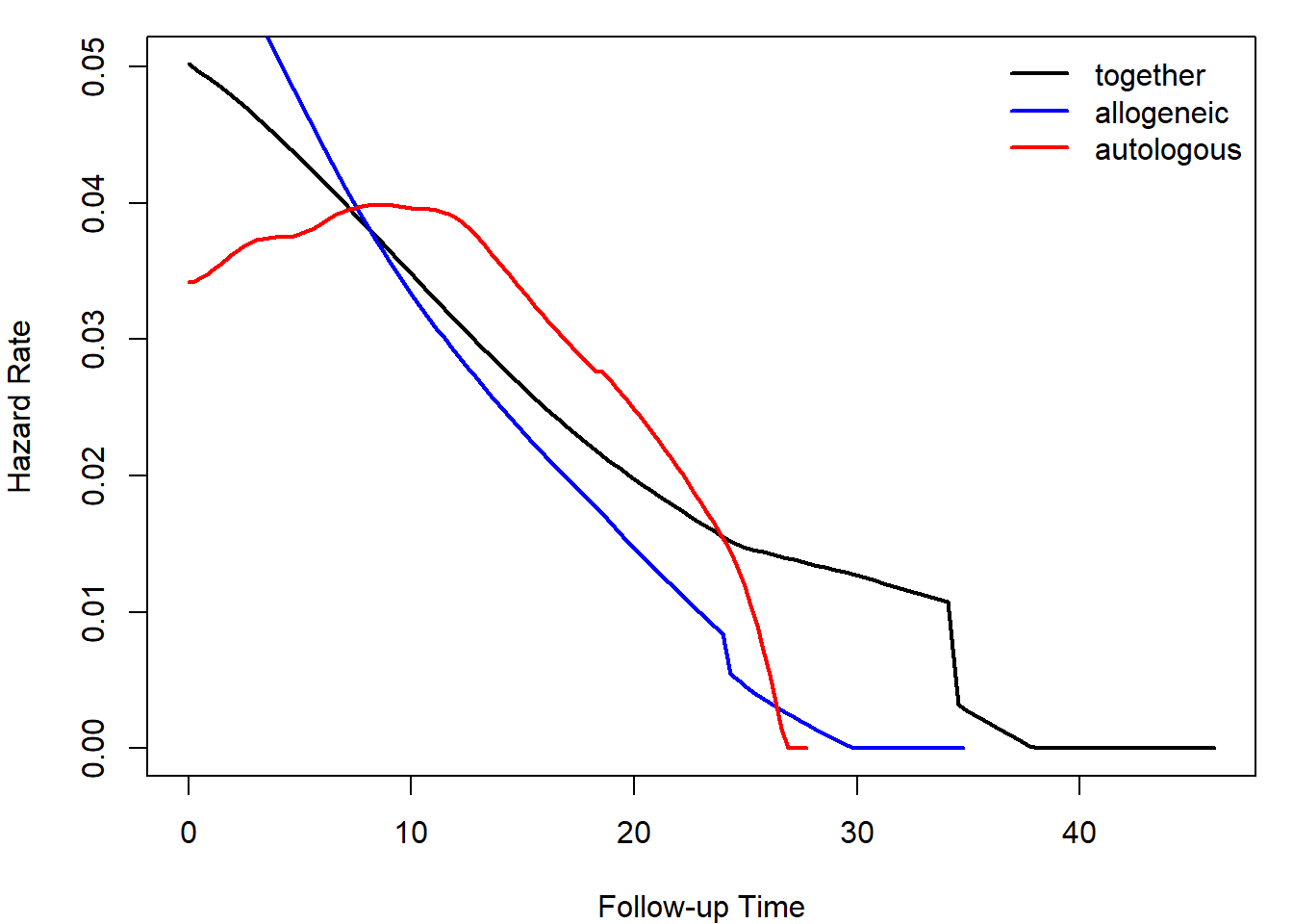 Calculate and plot smoothed hazard functions by the type of transplant. Distinguish the groups by color. Add a legend.