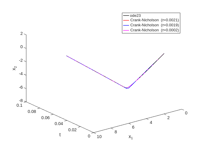 opt = odeset('RelTol',1e-5,'AbsTol',1e-6); % increase precision t0 = 0; T = 0.1; x0 = [2; 1]; figure; [t,x]=ode23(@linsystem, [t0, T], x0, opt); plot3(t, x(:,1), x(:,2), 'k', 'DisplayName', 'ode23'); hold on; xlabel('t'); ylabel('x_1'); zlabel('x_2'); view(-127.5, 30); xlim([0, 0.1]); ylim([0 10]); zlim([-8 2]); [te,xe] = crank_nicholson(@linsystem, t0, T, x0, 0.0021); plot3(te, xe(:,1), xe(:,2), '-r', 'DisplayName', 'Crank-Nicholson (\tau=0.0021)'); te xe [te,xe] = crank_nicholson(@linsystem, t0, T, x0, 0.0019); plot3(te, xe(:,1), xe(:,2), '-b', 'DisplayName', 'Crank-Nicholson (\tau=0.0019)'); [te,xe] = crank_nicholson(@linsystem, t0, T, x0, 0.0002); plot3(te, xe(:,1), xe(:,2), '-m', 'DisplayName', 'Crank-Nicholson (\tau=0.0002)'); legend('Location','NorthEast');