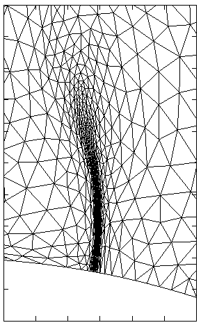 Distribution of Mach number along walls Detail of the triangulation Detail of the isolines of Mach number Distribution of the Mach number along walls. Detail of the mesh near the shock wave Detail of the isolines of Mach number near the shock wave
