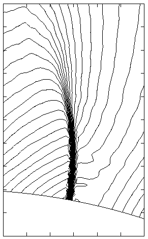 Distribution of the Mach number along walls. Detail of the mesh near the shock wave Detail of the isolines of Mach number near the shock wave