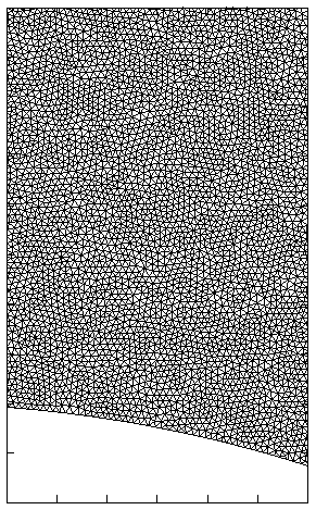 Distribution of Mach number along walls Detail of the triangulation Detail of the isolines of Mach number Distribution of the Mach number along walls. Detail of the mesh near the shock wave Detail of the isolines of Mach number near the shock wave