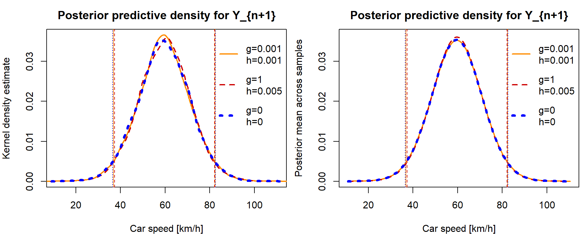 Extend the above function to generate also from the posterior predictive distribution of the speed \(Y_{n+1}\) of another car: \[\begin{equation}\label{eqpredhEN} p(y_{n+1}\,|\,\mathbb{Y}) = \int p(y_{n+1},\,\mu,\,\tau\,|\,\mathbb{Y})\,\mathrm{d}(\mu,\,\tau) = \int p(y_{n+1}\,|\,\mu,\,\tau,\,\mathbb{Y})\,p(\mu,\,\tau\,|\,\mathbb{Y})\,\mathrm{d}(\mu,\,\tau) = \int p(y_{n+1}\,|\,\mu,\,\tau)\,p(\mu,\,\tau\,|\,\mathbb{Y})\,\mathrm{d}(\mu,\,\tau). \end{equation}\] Consequently, calculate (based on at least 10,000 simulated values from the predictive distribution \(p(y_{n+1}\,|\,\mathbb{Y})\)) the 95% ET credible intervals for \(Y_{n+1}\) (again, while considering the three choices of hyperparameters \(g\) and \(h\)). How would you interpret the credible intervals for \(Y_{n+1}\)?
