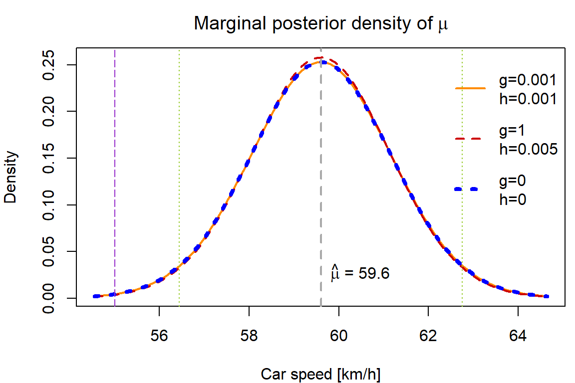 Derive the marginal posterior distribution for \(\mu\) and plot its density (in one figure) for the above choices \(g\) and \(h\). What is the posterior probability that the mean of the speed is greater than 55 km/h (again for three different choices of \(g\) and \(h\))?