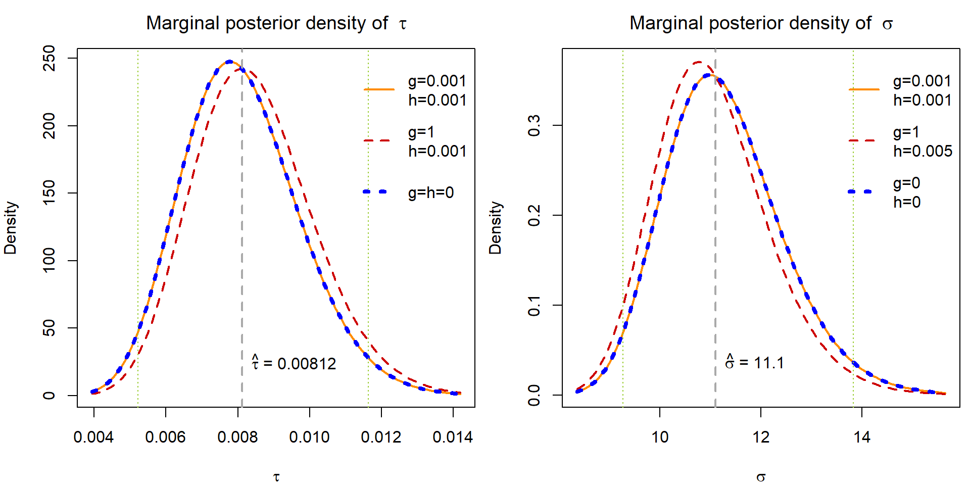 Derive the marginal posterior distribution for \(\tau\) and plot its density (in one figure) for the above choices \(g\) and \(h\). In the second plot, draw the marginal posterior densities for \(\sigma = \sqrt{1/\tau}\). Note that it is not necessary to explicitly derive the formula for the posterior density of \(\sigma\) for the purpose of plotting once you have a computer function to calculate the functional values of the posterior density of \(\tau\).
