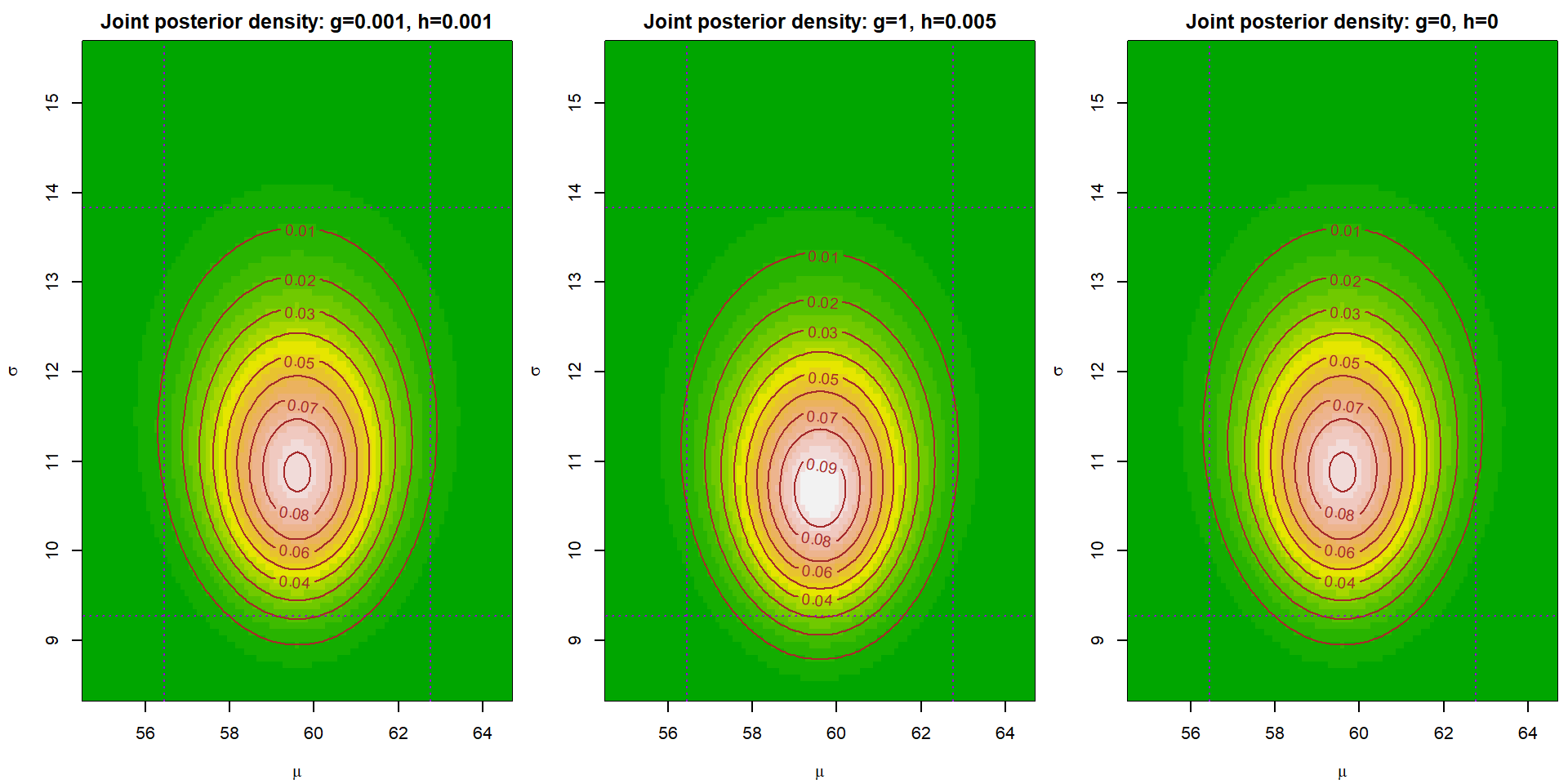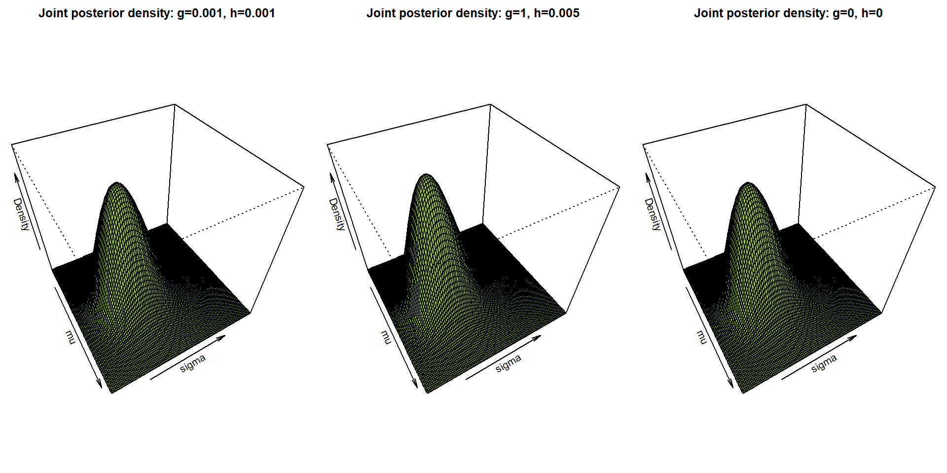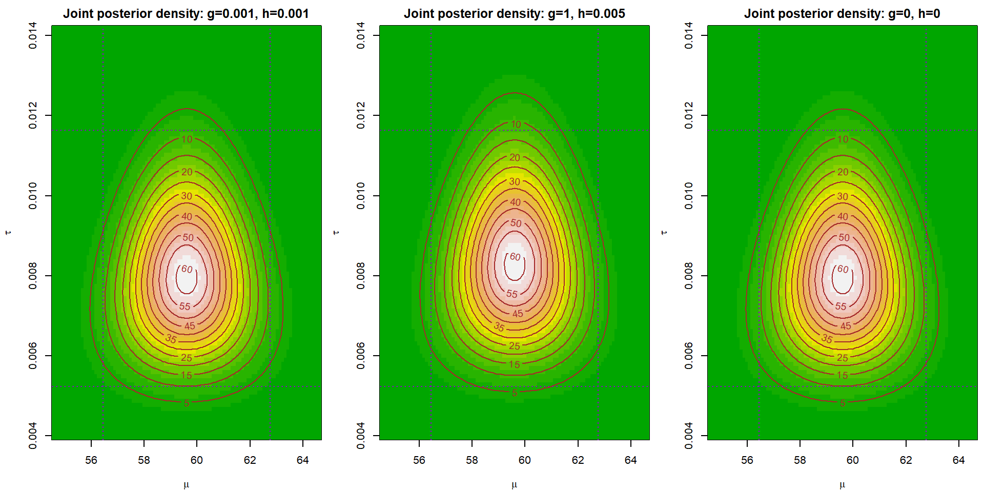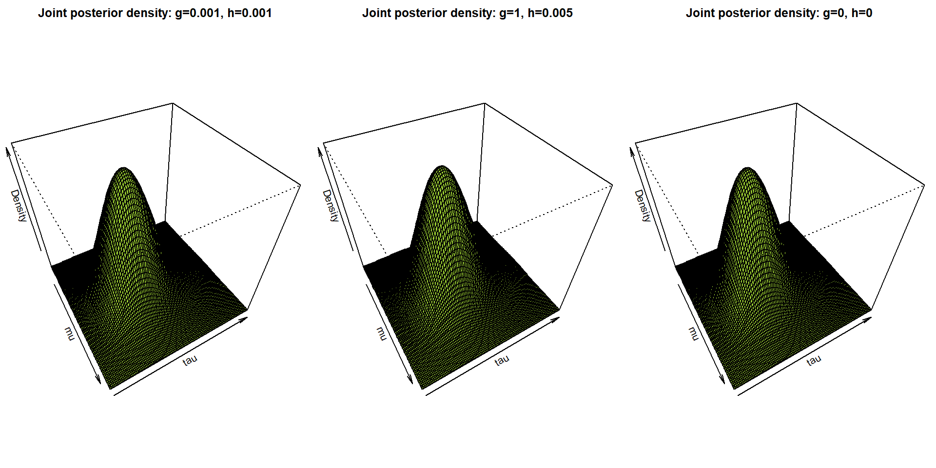 Draw (in three different plots) plot of a joint posterior density of \((\mu,\,\tau)\) for three different choices of \(g\) and \(h\). Note that you can use the relation \(p(\mu,\,\tau\,|\,\mathbb{Y}) = p(\mu,\,\tau\,|\,\mathbb{Y})\,p(\tau\,|\,\mathbb{Y})\) to calculate the functional values of \(p(\mu,\,\,\tau\,|\,\mathbb{Y})\).