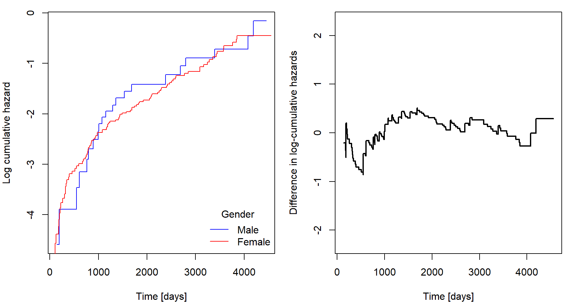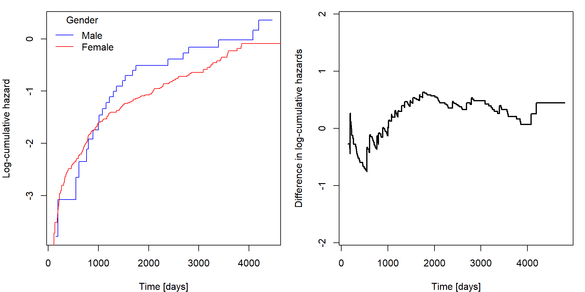 xlab = "Time [days]", ylab = "Difference in Log cumulative hazards",